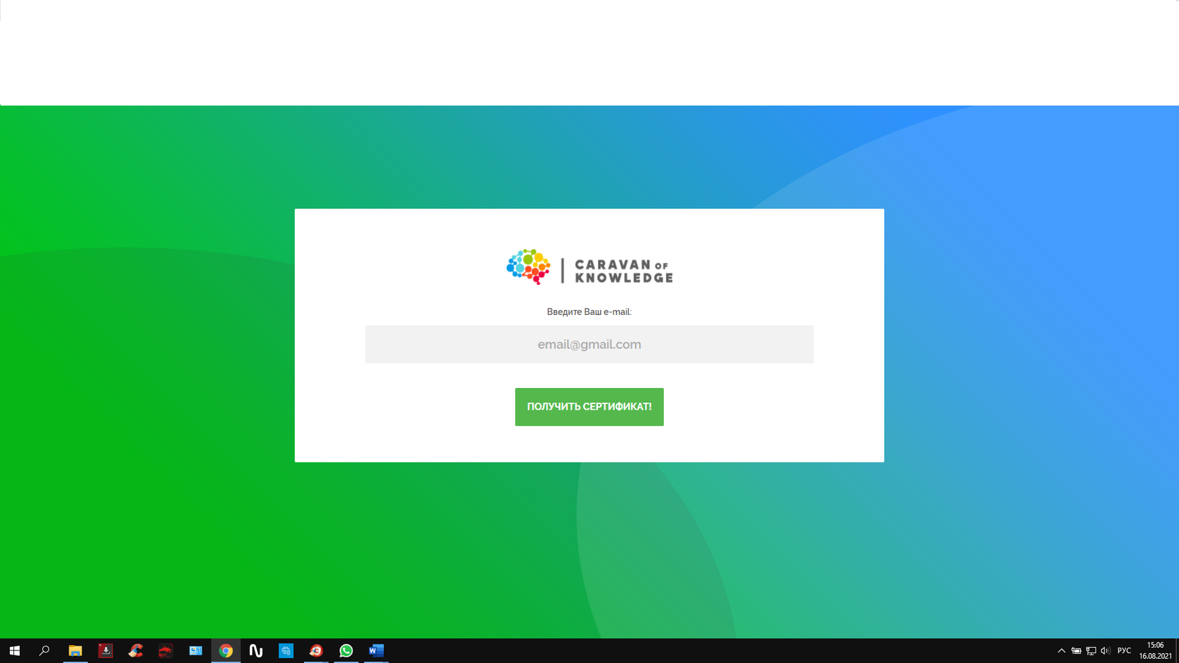 | Если по какой-то причине Вы не сможете скачать свой сертификат или система Вам выдаст сертификат который не заполнен, напишите техническому менеджеру Caravan of Knowledge на мессенджер Whatsapp по следующему номеру: +7 778 563 6893 Бауыржан.
